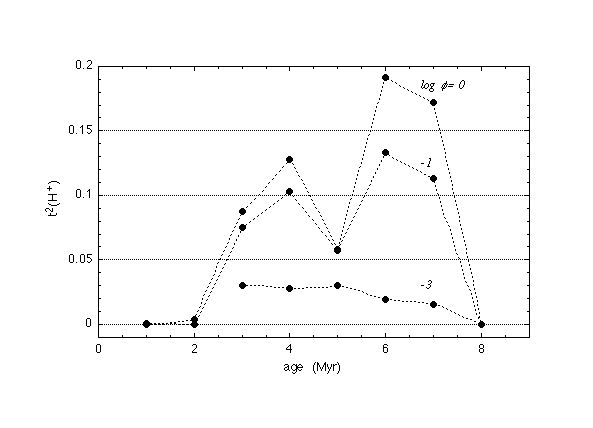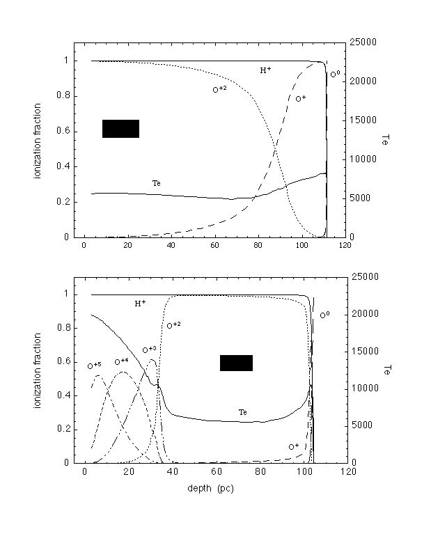 Figure 3 illustrates this more clearly. It shows the hydrogen and oxygen ionization (thin lines) and the temperature (thick line) structures at 2 Myr (upper panel) and at 3 Myr (lower panel). At 2 Myr, the structure is that of a typical nebula ionized by OB stars, with an inner large O+2 zone and an outer smaller O+ zone; the outer zone is somewhat hotter because the ionization there is produced by the higher energy photons that see lower absorption cross-section and thus a longer mean free path. The mean temperature does not change much, staying relatively low between 6000 K and 8000 K; thus both the H+ and the O+2 are sampling much the same temperature, and t2 is small.