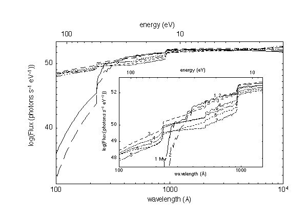 The subsequent evolution of t2 with the age of the burst, given by the evolution of the ionization structure, is governed by the relative behaviour of the SED between 13.6 eV and ~30 eV on one side, and above ~30 eV on the other side. The former spectral range follows a steady decline produced by the aging of the burst, while the SED at higher energies is controlled by the ups and downs of the WR stars.Figure 4. Spectral energy distribution of the ionizing cluster as a function of wavelength and energy for ages 1 Myr to 7 Myr. Note the dramatic changes at 3 Myr, when the SED hardens significantly.